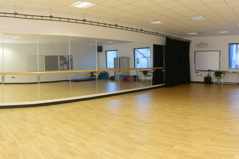The school has a fully functional dance studio, with mirrors and ballet bar covering one side of the studio.