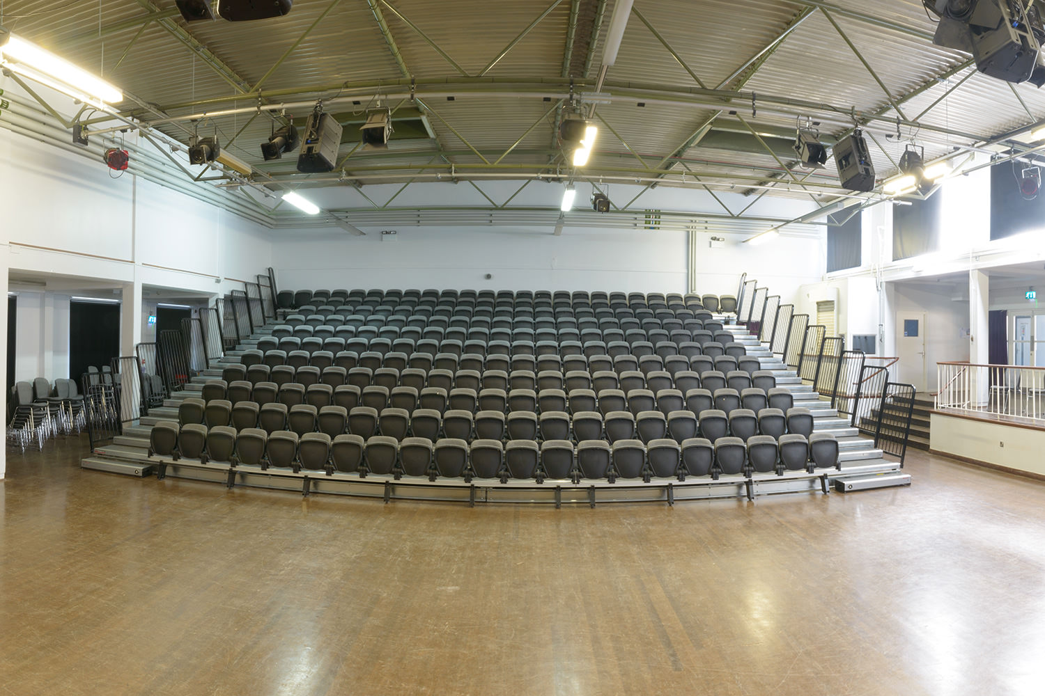 The Main Assembly Hall on the KS4 (Upper Site) with a stage at one end which can be segregated with the stage curtains. The floor is laid to parquet flooring. The hall also benefits from tiered seating which can accommodate 235. This seating can be supplemented by 120 chairs.